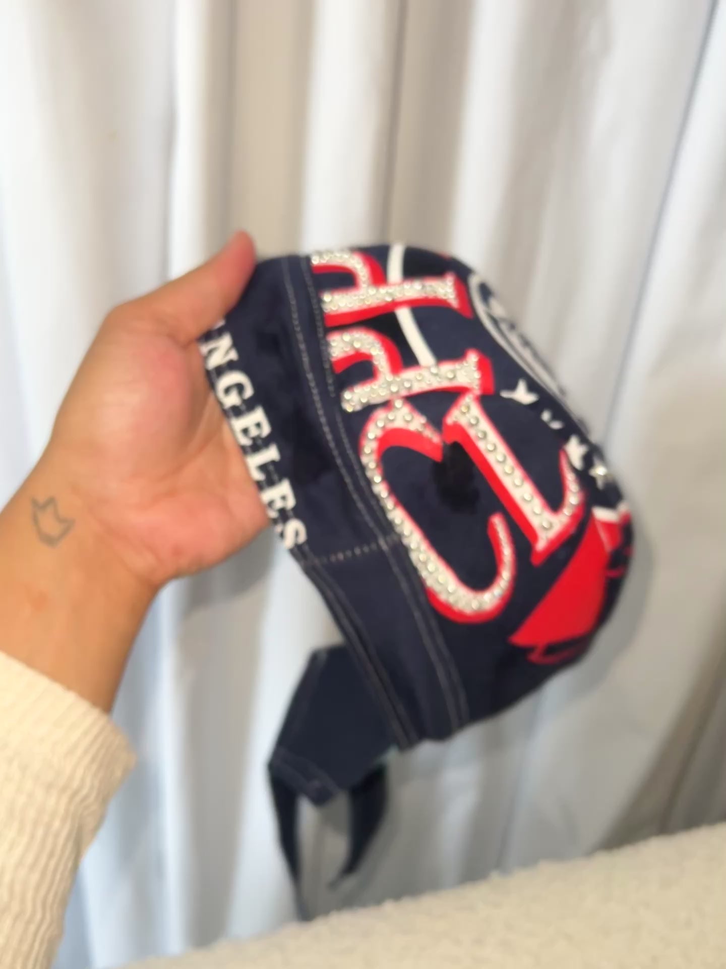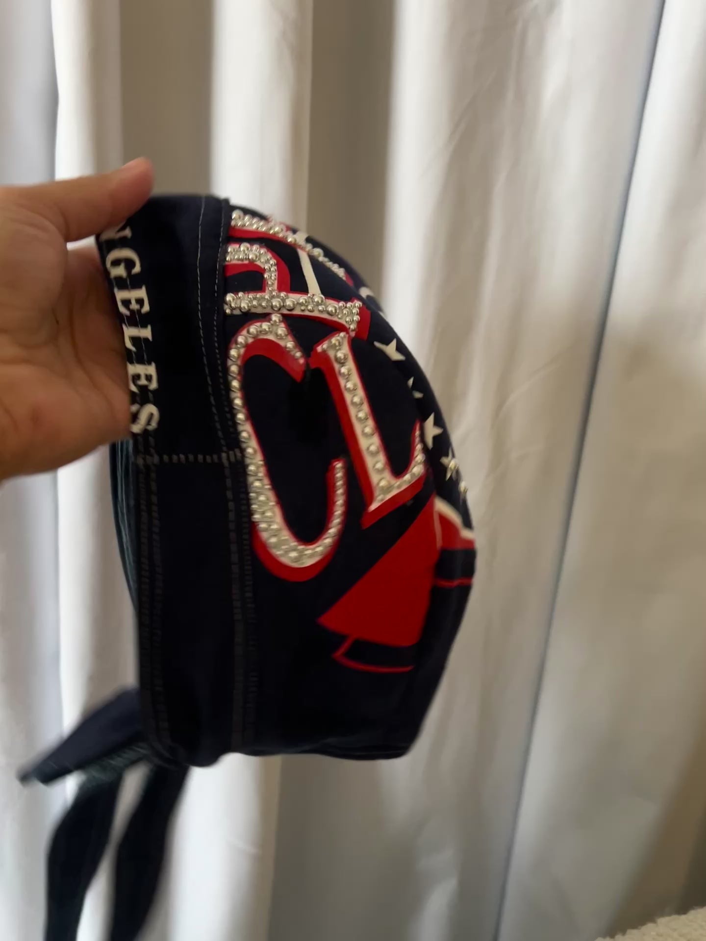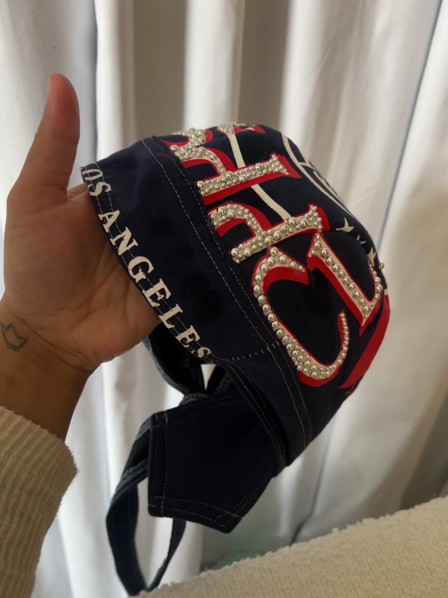 Tan vintage graphic biker cap. Extra gems. Color placement may vary slightly. Silver studs.