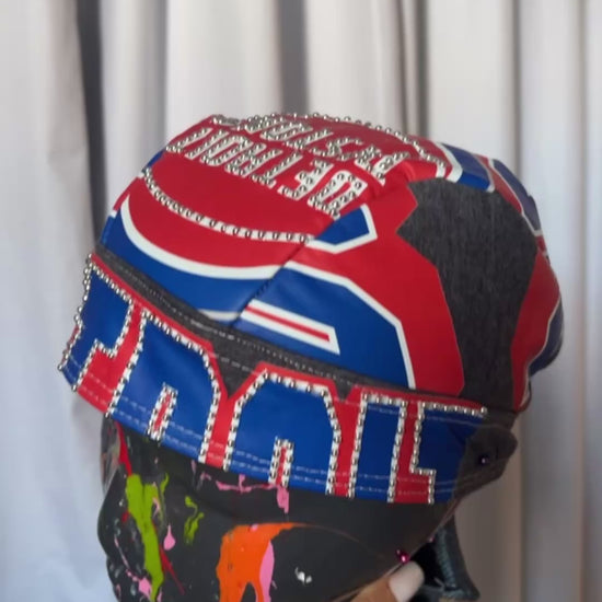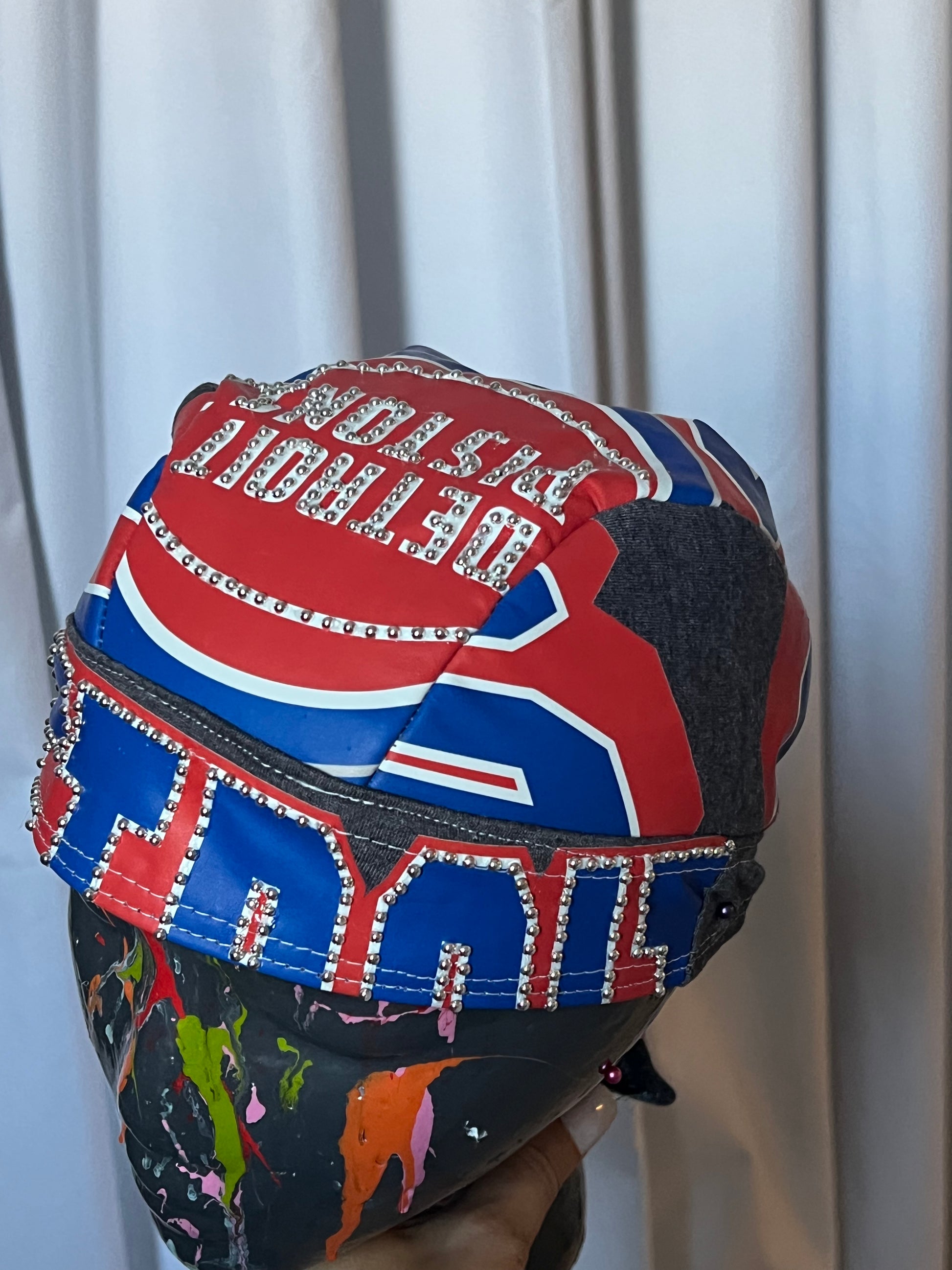 Tan vintage graphic biker cap. Extra gems. Color placement may vary slightly. Silver studs.