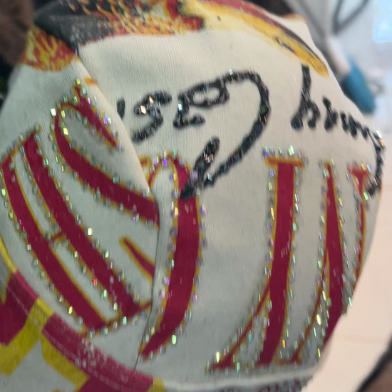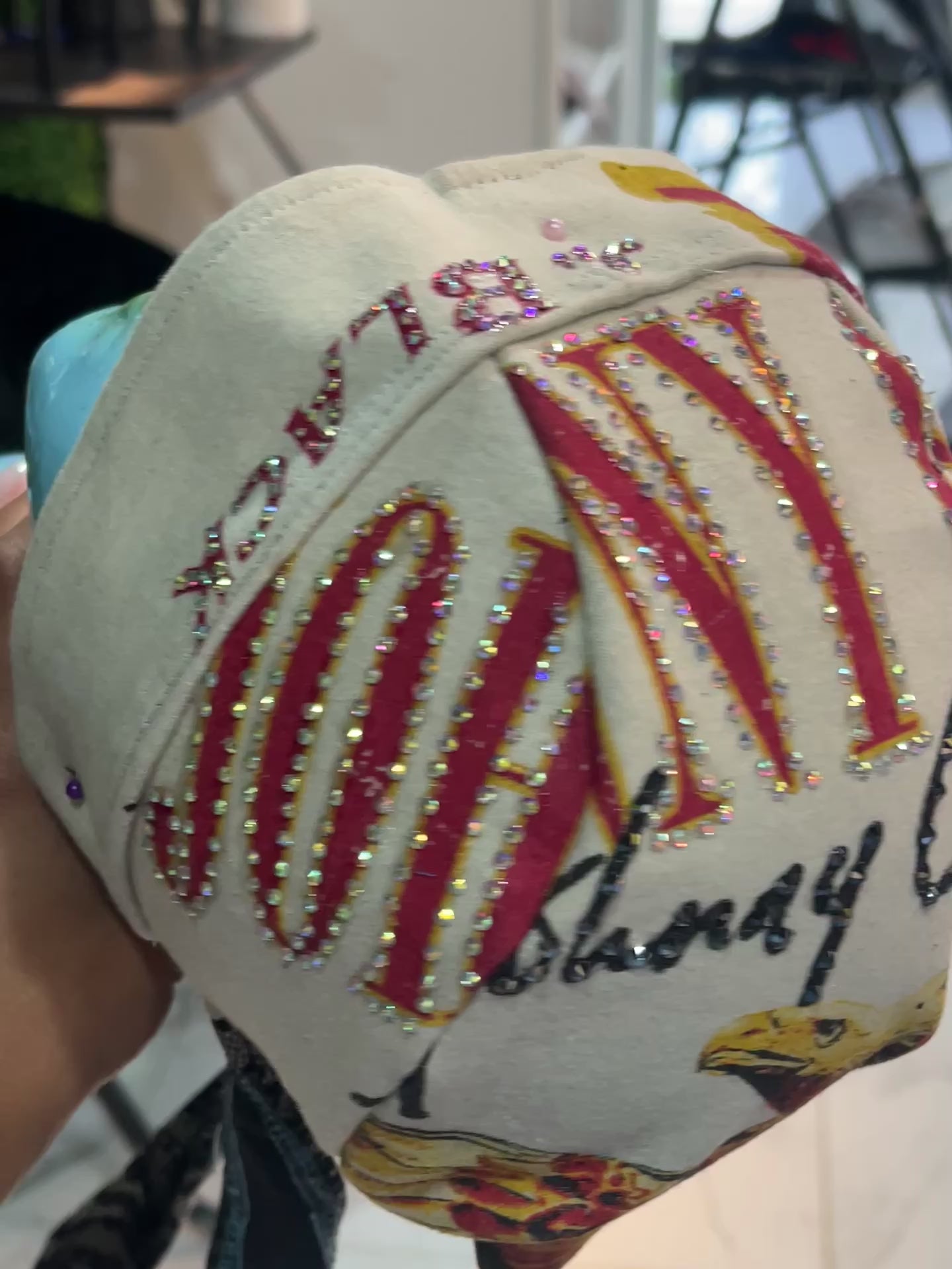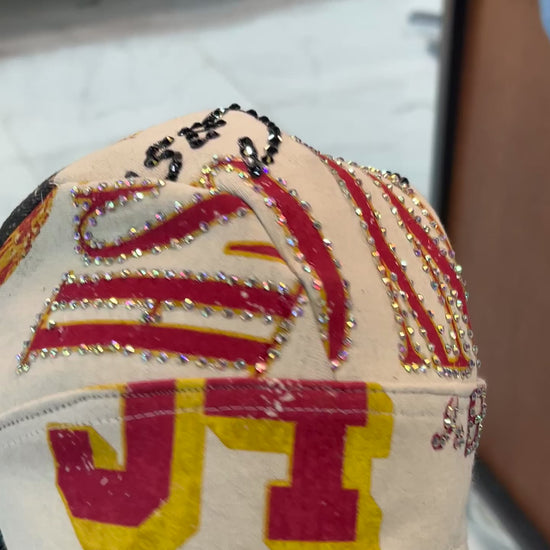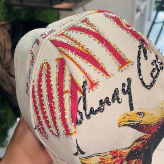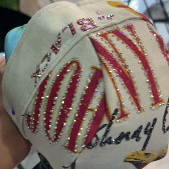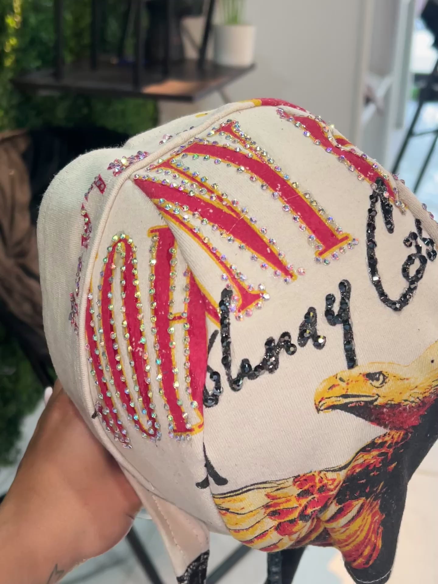 Tan vintage graphic biker cap. Extra gems. Color placement may vary slightly. Silver studs.